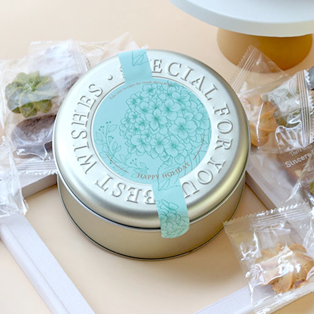 100個入り シール付き クッキー缶 丸型 空き缶 ブリキ缶 梱包 陳列 小物入れ 北欧 カフェ お菓子 洋菓子 和菓子 パン ベーカリー 飲食 備品 お洒落 可愛い YKS-0084